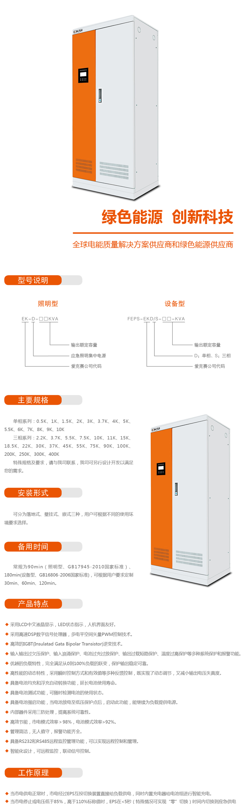 EPS:在電網(wǎng)正常時(shí)處于睡眠狀態(tài),耗電不足0.1%,無電網(wǎng)供電時(shí),其效率92%以上