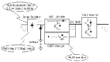 新型全IGBT UPS結(jié)構(gòu)(高頻機)如下,基本結(jié)構(gòu):不控整流+DC/DC倍壓環(huán)節(jié)+獨立充電器+逆變器